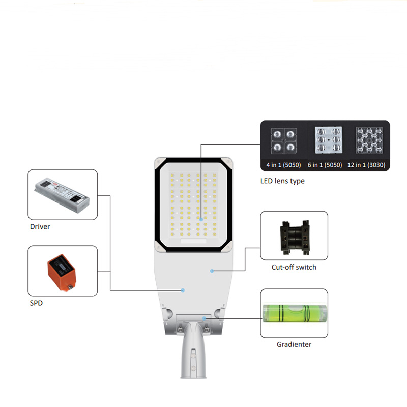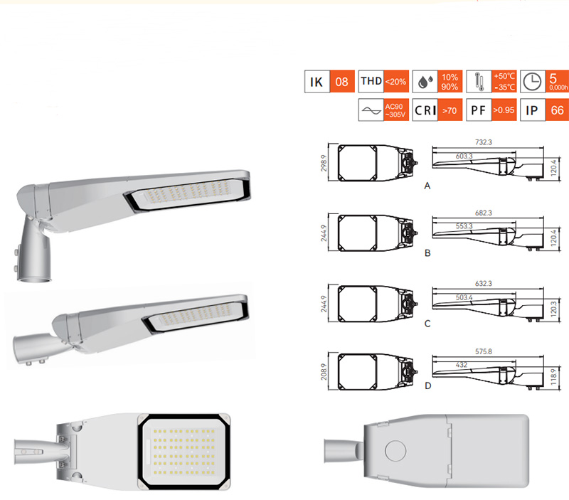 5 წლიანი გარანტია 50w 80w 100w 150w 240w LED ქუჩის ნათურაზე, IP66 წყალგაუმტარი 3000k 6000k ქალაქის LED გზის განათებაზე