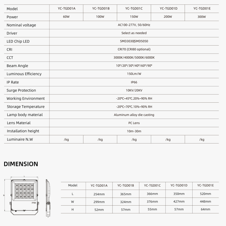 | YC-TGD01-50W | 358*294*52 | 50 ვტ | Heat sink Aluminum body,Glass,Bracket,304 screws, PCB, ლინზა. |