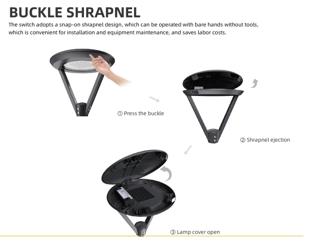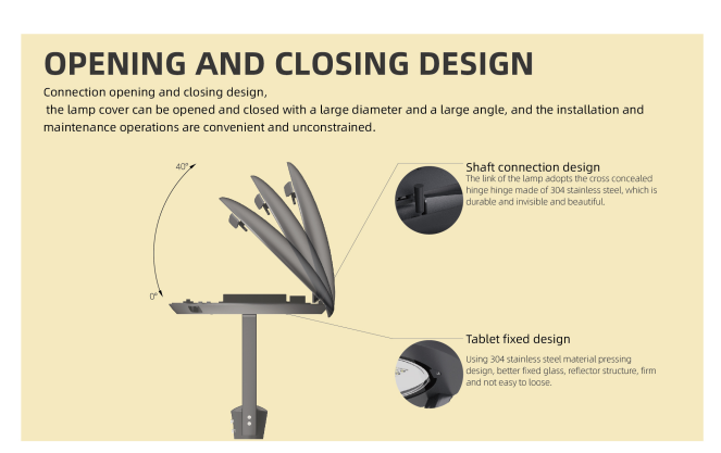 შეერთების გახსნისა და დახურვის დიზაინი, ნათურის საფარის გახსნა და დახურვა შესაძლებელია დიდი და დიდი კუთხით,