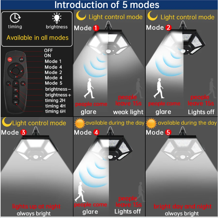 2. 3 ღამის რეჟიმი და ტაიმერი. ეს მზის ენერგიაზე მომუშავე შიდა განათება მაღალი მგრძნობელობის მოძრაობის სენსორის ფუნქციებით.