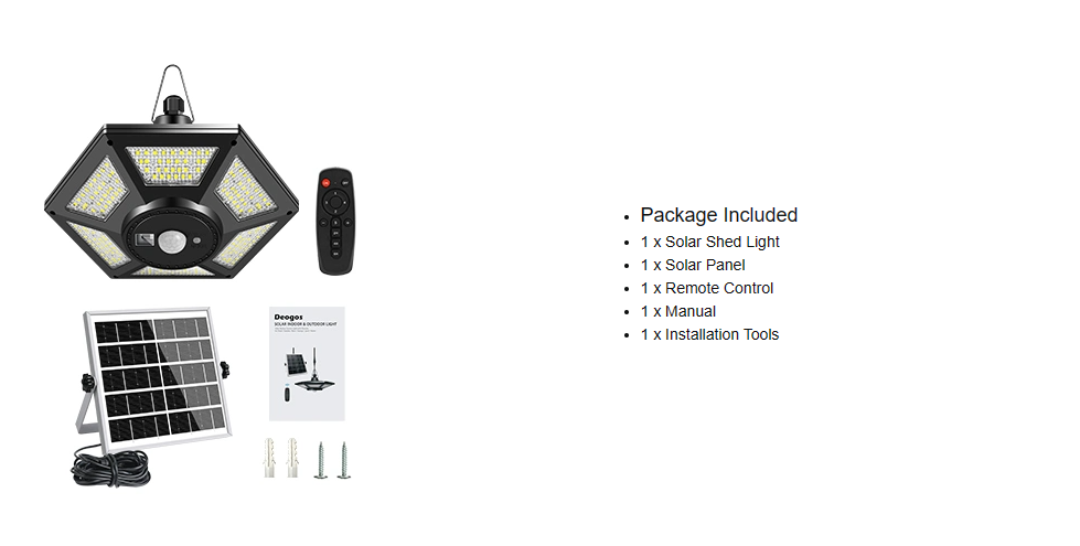 | შედის კომპონენტები | მზის პანელი, დისტანციური მართვა, სამონტაჟო აქსესუარები, განათების მოწყობილობა |