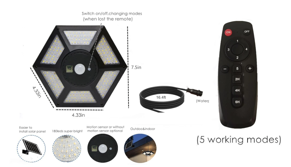 180 LED-ით, რომელიც 1000 ლუმენს გამოიმუშავებს, ეს მზის ენერგიაზე მომუშავე სავაჭრო ნათურა კარგად ერწყმის ნებისმიერ ბნელ ადგილს.